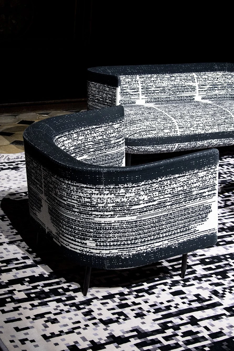 Through this project, the creators sought to give users the opportunity to ‘sit down in a cloud of pixels’. The pattern of the rug, as well as the textile covering the furniture returns to the theme that is so dear to Miguel Chevalier, pioneering artist of virtual and digital art. These pixels are to him the ‘equivalent of the pictorial touch, the metaphorical image of the quantitative explosion of digital data which compels to find new ways to store the data, to see and analyze the world’. According to the French artist, the pattern also echoes the writings and the many laws drafted by the institutions of the Republic where this collection of furniture shall be set.